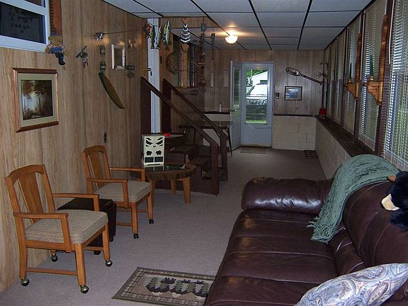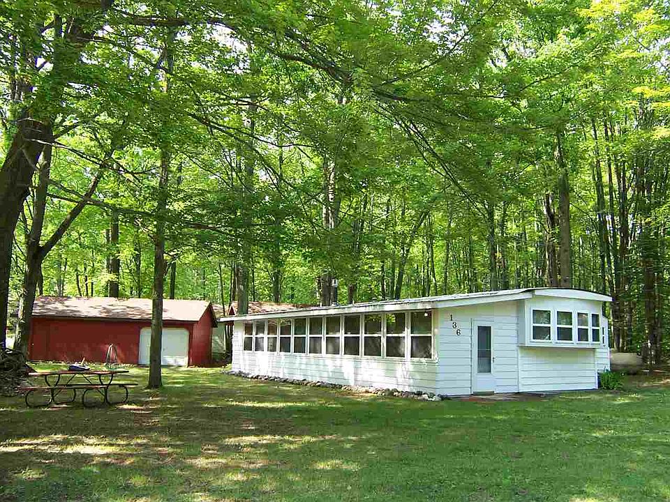 Beautiful treed lot in nice section of the subd. only a mile from the S. State Park for lake access and is very close to state land. This very clean 3 Bdrm. home has been meticulously maintained over the years by loving owners. Home has a living room and two bedrooms in main section, and has a stick built addition consisting of family room and 3rd. Bdrm. Heat is by forced air and free standing gas log heater. It is being sold furnished and decorated. The exterior features a newer metal roof over entire home, and two garages for all the toys and vehicles. (Riding Lawn Mower is Excluded). Very few like this one in this price range.
