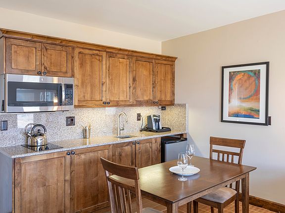This is a rare kitchenette unit, west facing with Wilson and Sunshine views.Enjoy the 42,000 square foot spa, owner discounts on food and spa services. Concierge services, ski in/ski out valet, clay tennis courts and pickleball, tee times after 1pm. The hotel condo is in the rental pool with Peaks Hotel and Spa.