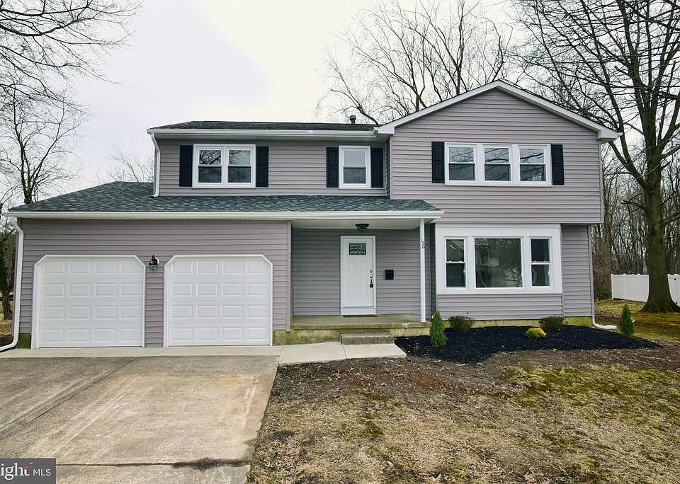 Welcome home to this tastefully redone 4 bed, 2.5 bath home in Mt Laurel! Everything about this home has been updated so all you have to do is move in! Entering into the foyer, you are greeted with brand new hardwood flooring that runs throughout the entire first floor. The stairs, to your left, feature a custom handmade wood and iron railing. The living room is to your right, with a large 3 section window overlooking the front yard and recessed lighting. Moving from the living room toward the rear of the home, you will find the dining room with a chandelier; the kitchen is beyond the dining room and has been totally redone. Here you will find up-to-date touches such as black quartz on the main counter tops, subway tile backsplash, and new stainless steel appliances. The island features extra storage, gray cabinets, and white quartz counter top with an overhang for additional seating. In addition, there is a breakfast nook for casual dining as well as brand new sliders to the new 14x12 foot concrete patio. On the second floor are four newly carpeted bedrooms and a full hall bath. The master bedroom features a walk-in closet and a full bath. The bath has been updated with a custom tile shower with glass doors, tile flooring, and a double vanity with storage. The full hall bath offers a tub/shower combo, marble double vanity with storage, and on-trend tile flooring. This home also has a full basement that offers plenty of storage space. Further updates include: new roof, new hot water heater, new HVAC, new garage doors, fresh neutral paint throughout, new windows, and new vinyl siding. You won~t have to worry about maintenance for a long time in this home, so come take a tour today!