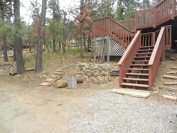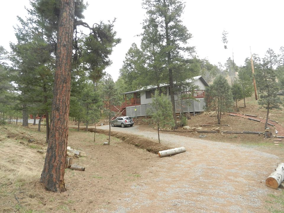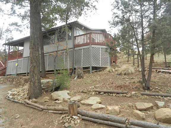 Large cabin (1297 sq ft) on two wooded lots in the tall pines of Ruidoso's Upper Canyon. 3/2 with large sleeping porch/bonus room. remodeled kitchen w/ custom cabinets. Laminate wood flooring except in bedrooms (carpet) and guest bath (tile). Large decks on both sides of cabin including covered porch area off living room. Beamed ceilings in living room/kitchen and large stone wood burning fireplace. Newer metal roof/composite siding. All appliances convey. On city utilities including sewer. Ceiling fans and french doors in all living areas. RV parking/wiring. Plus Elk, deer, and other wildlife and view of Sierra Blanca.