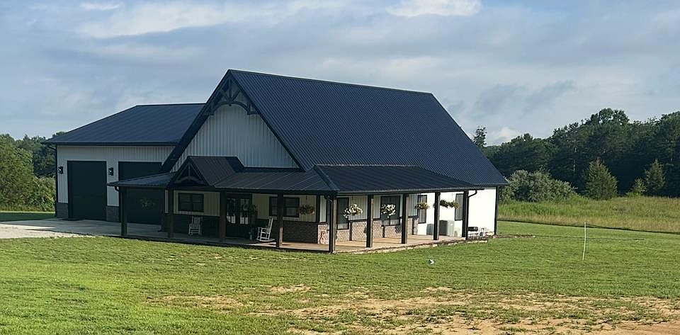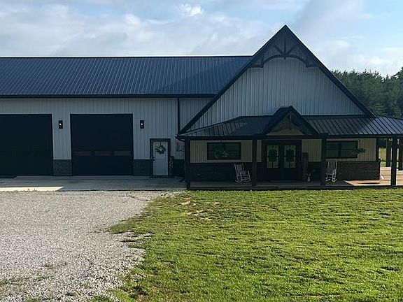 This Barndominium style home features 3 bedroom and two bathrooms. Built in 2023, this property offers 6.3 unrestricted acres with pole barn with electric. As you enter the home it offers open floor concept with 14 ft high cathedral ceiling. Living room has natural gas fireplace, water proof laminate flooring is throughout the home. Kitchen offers soft close cabinet doors, 5X5 island, walk in pantry, gas oven/stove, quartz countertops and all matching appliances. Loft area upstairs overlooks the living room and kitchen and offers another 800 square ft of living space and has a split unit for heating and cooling. Master bedroom offers a large walk in closet with shelving and drawers. Master bath has double vanity, jet tub and tile shower. Hallway and bedrooms all feature 9 ft. Ceilings. Home has a tankless water heater the attached garage offer 16 ft ceilings with two 12X12 garage doors and a total of 2000 square footage and all insulated. YARD IS BEING RE-SOWN.