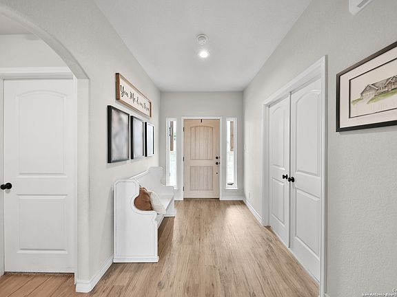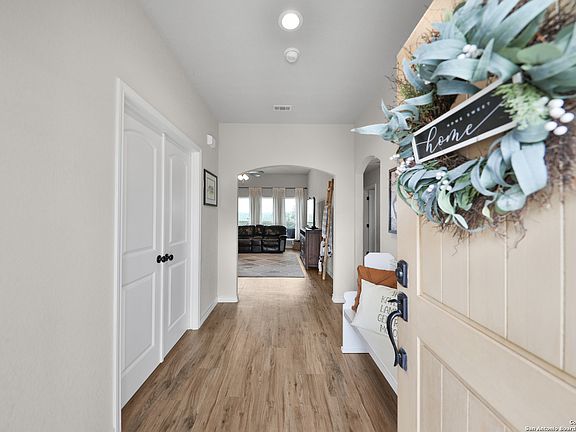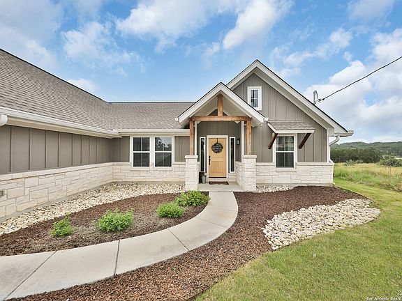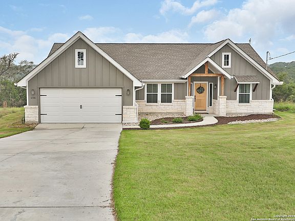 Welcome home to Rockin' J Ranch, home of the Vaaler Creek Golf Community! With amazing hill country views to enjoy morning sunrises and evening sunsets from the convenience of your own covered patio. This beautiful and well maintained 1 story home boasts 4 bedrooms and 2 full baths with an open floor plan providing tons of natural light from the sizable windows to illuminate the entire space. The kitchen features a farmhouse porcelain sink, stylish black hardware, stainless steel appliances and generous counter space for meal prepping. A huge walk in pantry with plenty of storage and upper and lower cabinets provide ample space. The seamless flow to the dining and family room creates an ideal setting for hosting gatherings. This property offers a perfect blend of functionality and luxury. The neighborhood boasts a pool, pavilion and pond to name a few. Vaaler Creek's 18-hole golf course offers a driving range and ownership will allow you discounted golf fees. Rockin' J Ranch is a convenient location and easy access to San Marcos, Canyon Lake, Austin, San Anotonio, Boerne and more. Don't miss out on the chance to make this your next dream home!