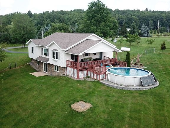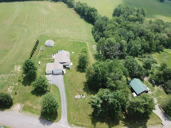 Fabulous ready to move in - 4 bed, 3 bath RANCH on almost 13 acres with attached heated garage, 32 x 40 Barn-workshop w/14 ft ceilings on a double lot! Welcome home to the open floor plan with living room, dining, kitchen, master ensuite, add'l 2 bedrooms and full bath, laundry and built-in desk all on the main floor. The kitchen has a large center island w/ seating, stainless steel appliances, corian countertops and sliding doors leading out to back porch overlooking the pool and yard-perfect for entertaining! The finished full basement with radiant heat features a family room with surround sound, sliders leading out to the back patio, 1 bedroom, full bath and enough room for tons of storage along with an area for a fitness center! The property has acreage for gardening, animals, recreational vehicles along with a shooting range, chicken coop area, a drive through shed, tree house and the additional lot with the 2nd well! If you want to bring your family or friends or possible rental income you can put an additional home on the 2nd lot! The added surprise is the barn which is big enough for RV parking and a car lift it is insulated and had a corn stove for heating! MUST SEE!