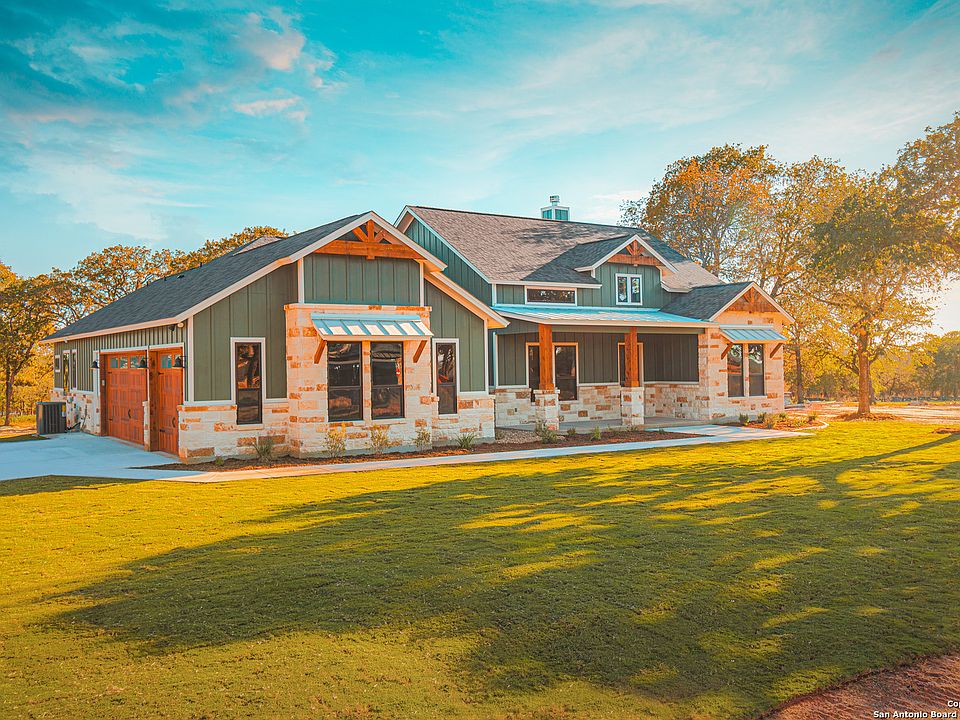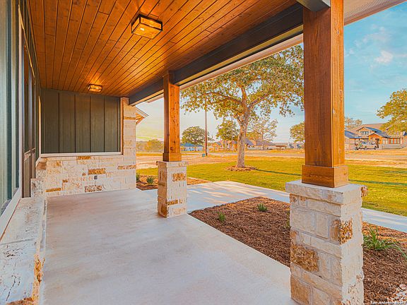 This property exudes Elegant Farmhouse Charm: Newly Crafted with 3-car garage, Beautifully Situated on 1-Acre of Wooded Countryside! The attractive exterior beckons you to come experience Delightful Finishes throughout, offering spacious open living that incorporates both Dramatic Accents & Comfortable Features. Expansive ceilings welcome you in the Entry & Dining, with a graceful vaulted Living Room ceiling & solid plank mesquite mantel at the fireplace ... chic wood-tile flooring flows seamless through these open spaces. The "heart of the home" Gourmet Kitchen is Incredibly Stylish: Gleaming Quartzite Counters, Classic Custom Cabinetry w/Ceiling Height Glass Uppers, Generous Island w/smart pop-up charging stations, KitchenAid Stainless Steel Appliances, Champagne Bronze hardware, black&gold Faucet + Pot Filler, and a Fabulous Pantry w/extra cabinetry! The thoughtful layout affords separated bedroom areas for convenience & privacy: Master Retreat affords a Luxury Bath with sparkling tile, free-standing tub & dual-head shower; 2nd & 3rd bedrooms access the Hall Bath w/tiled walk-in shower; 4th bedroom is separated with its own bath that also opens to the back patio (ideal for outdoor activities & future pool). Exceptional Laundry Room w/Abundant Cabinetry & sink; and the Mud Bench at hall by garage adds Beauty & Function. Enjoy the Pleasant Countryside from the Covered Back Patio, and appreciate being under 10 minutes from the amenities of La Vernia, with big city San Antonio within 35 minutes. 1-2-10 year bonded builder warranty. Hondo Ridge is a wonderful country neighborhood with the advantage of Fiber Internet. Come enjoy!