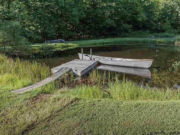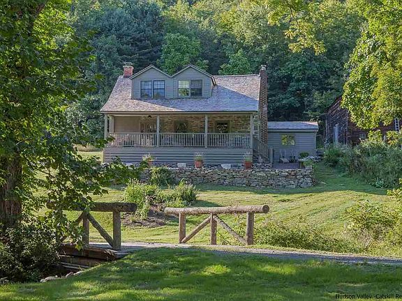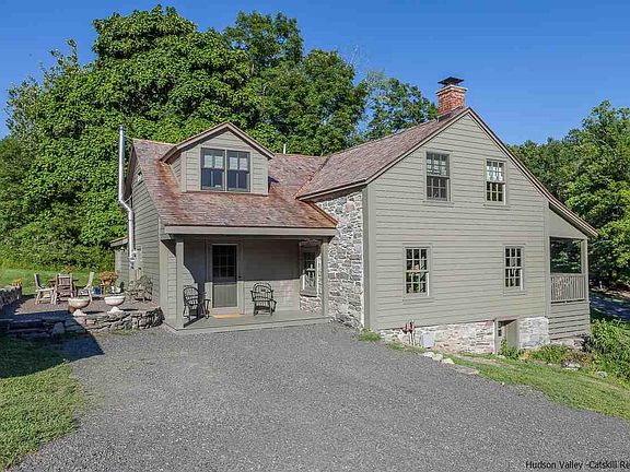 Experience total privacy and seclusion on this romantic 70-acre property with the rare combination of a renovated 18th century stone home at the end of a private road, nestled in its own little valley. Wind down the gravel path, past the pond and over the bridge that crosses the Praymakers Brook, and then gently up the hill to a series of stone walls and patios that surround the house. The historic heart of the home is the living/dining room with original wide plank pumpkin pine floors and beamed ceiling, Rumford fireplace and direct access to the front porch which spans the front of the house and looks toward the pond and brook. The rear section of the first floor, added around 1850, encompasses the state-of-the-art kitchen and a sitting room with a wood stove, beaded pine paneled walls and shiplap ceiling. Entry area with slate floors and exposed stone wall opens to a small side porch and kitchen opens to a patio from which the kitchen garden is a few steps away. The master bedroom, with vaulted ceiling dormers at both ends, catches both morning and afternoon sun, and features the same paneling and shiplap treatment as in the kitchen, as does the second floor bathroom, with exposed stone, bluestone floors with radiant heat, and a stone-clad walk-in shower. Two guestrooms, one also with vaulted ceilings, are equally sunny, comfortable and relaxing spaces. The magic continues out on the property, where there are so many beautiful spots to linger and special places to wander and get lost. Wide trails that wind through the woods are countless, yet there's plenty of open space for adding a pool, tennis court or additional structures. Period barn is ripe for restoration and 30x70 former stable could be a spacious guesthouse, studio or creative space.