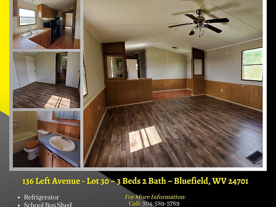 136 Left Avenue Lot 30 ~ 3 Beds 2 Bath ~ Bluefield, WV 24701 LEASE OPTION (Path to Home Ownership): Initial payment: $1,500 with no payments due until the 1st of the following month! Monthly payment: $825/month includes lot rent and curbside trash service. No utilities included. or RENTAL: Security Deposit: $825. Can be made in payments if needed. Monthly payment: $825/month includes lot rent and curbside trash service. No utilities included. Sorry, this home is not HUD approved. This three bedroom two bath single wide mobile home is tucked into the hills at The Oaks MHP located behind the brushfork Armory and features bright spacious rooms, two full bathrooms, small yard and great views! Trash is included. Christian Management Corporation Office Hours: Mon-Fri 9:00AM-5:00PM & 10:00AM-2:00PM the 1st Saturday of every month You can view THIS property 7 days a week! Most pets welcome with a $300.00 pet fee per pet and signed pet agreement. Maximum 2 pets. No aggressive breeds due to insurance restrictions. Clean, safe, quiet, crime & drug-free are our priorities for our residents! We support Equal-Housing Opportunities! Good people with good, bad, low, or no credit but stable employment or Social Security are welcome. -MUST pass background check -NO evictions in the last 7 years -NO sex offenders Is this property not what you are looking for? View our other available #homes, #mobilehomes, #apartments, and more on our Facebook or our website! LEASE OPTION (Path to Home Ownership): Initial payment: $1,500 with no payments due until the 1st of the following month! Monthly payment: $825/month includes lot rent and curbside trash service. No utilities included.