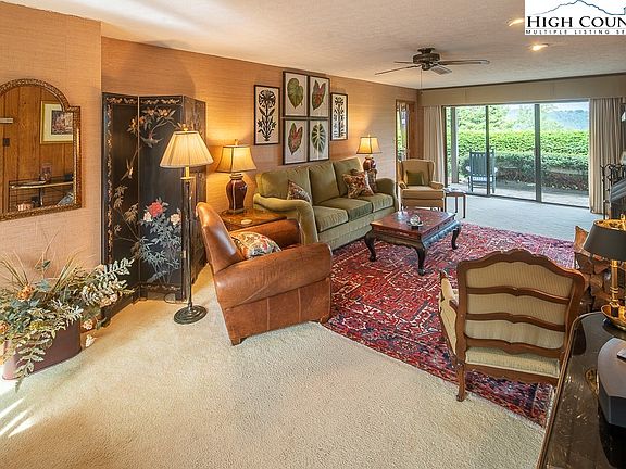 In the heart of Mayview, Blowing Rock's most coveted neighborhood, is the Mayview Manor Court Townhomes & Condos. Originally & appropriately called Cloudland, your friends will covet your location. Gated. With historic ties to the Mayview Manor, it is one-level. Walk down to Bistro Roca for a cocktail & into the village for ice cream. Private outdoor swimming pool. Friendly year-round & summer neighbors. One step in from parking lot to flagstone porch covered entrance. Step through the foyer to open dining & living room. Renovated kitchen, window box, countertops, pantry. Extinct clear chestnut siding lines the walls. Grandfather Mountain green granite, wood-burning fireplace. Walk out sliding glass doors to a majestic view of Grandfather Mountain & Elliot Dangerfield's Westglow off the living room and both bedrooms. Song birds and hummingbirds won't mind you as you read on the back porch. An electric shade covers the west-facing back porch. Roomy closets. Double vanities in both ensuite bathrooms. One designated parking space and guest spaces. Outdoor pool, gazebo and grill. 3 month minimum rental period. Most furniture conveys. HOA is repairing a pier in need of support.