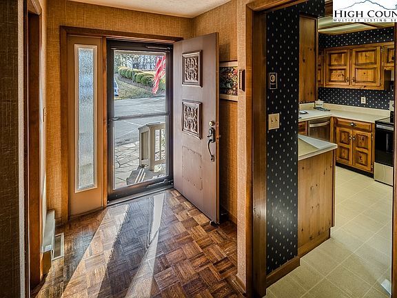 This generational property is on the market for the first time in 35 years! Meticulously cared for, this condo has clear chestnut (extinct) paneling and Grandfather Mountain stone saved from the historic Mayview Manor Hotel. It has arguably the best west facing Grandfather Mountain views of all of the other units. Take two steps in from the flat parking area to enter the parquet wood foyer. The kitchen boasts brand new stacked washer/dryer and brand new stainless steel dishwasher, stove, and microwave/hood. Half bath for guests. Open floor plan dining and living area enjoys a wood burning fireplace which is plumbed for you to add a gas starter or gas logs. Lower flagstone porch has a hedge for privacy and a grassy area for pets. Hello, Grandfather Mountain! He is in full view from both covered back porches. The outdoor swimming pool is in view from the kitchen and the upper second bedroom. Beautiful grasscloth wallpaper. Yes, there is also a view of Grandfather Mountain from the primary ensuite bedroom. Three month minimum rentals. It is less than a mile to Main Street shopping and restaurants. These go fast, you know what to do!