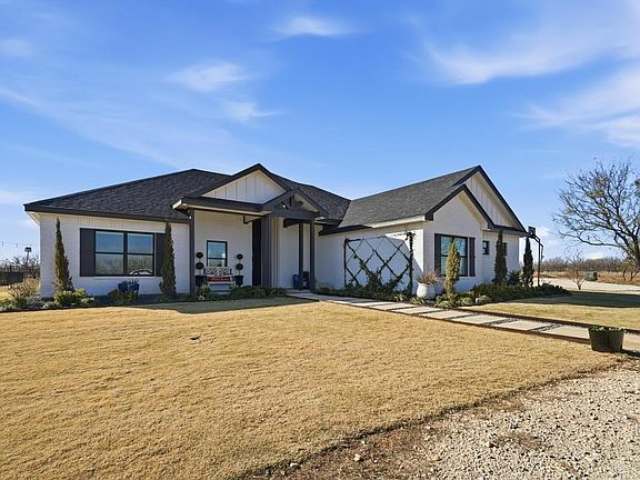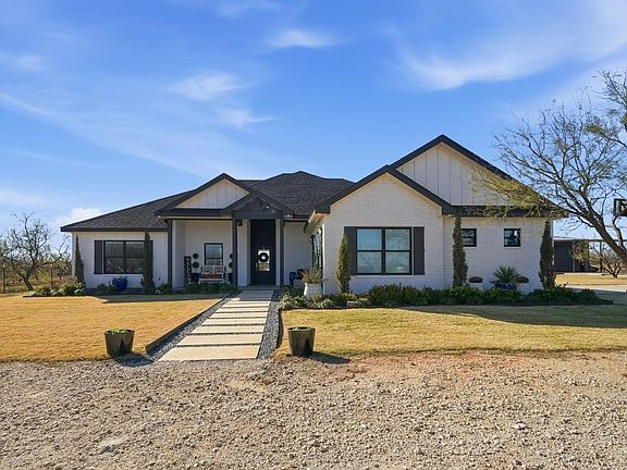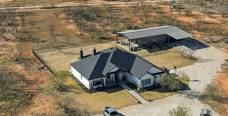 Discover refined country living in this exceptional home set on 10.15 acres in the highly regarded Jim Ned school district. The main residence features 3 bedrooms and 2.5 bathrooms with a thoughtfully designed split floor plan layout. The open floor plan in the living room features an additional sitting area ideal for entertaining and a wood burning fireplace. The kitchen features Quartz countertops with a large island, farmhouse style sink and premium Cafe' appliances that deliver a sleek, modern aesthetic and high-end performance. Beyond the home, a 70x30 custom building includes a large covered patio facing the backyard and a 715 square feet finished room with half bath ideal for entertaining, remote work, or separate guest quarters. The building also includes spray foam insulation, a 30x30 workshop, covered parking, and RV space with 50amp electric hookup. The property is fully fenced with goat wire and includes a loafing shed for livestock. This is a rare opportunity to enjoy modern living with room to roam, where endless possibilities are as big as the West Texas sunsets.