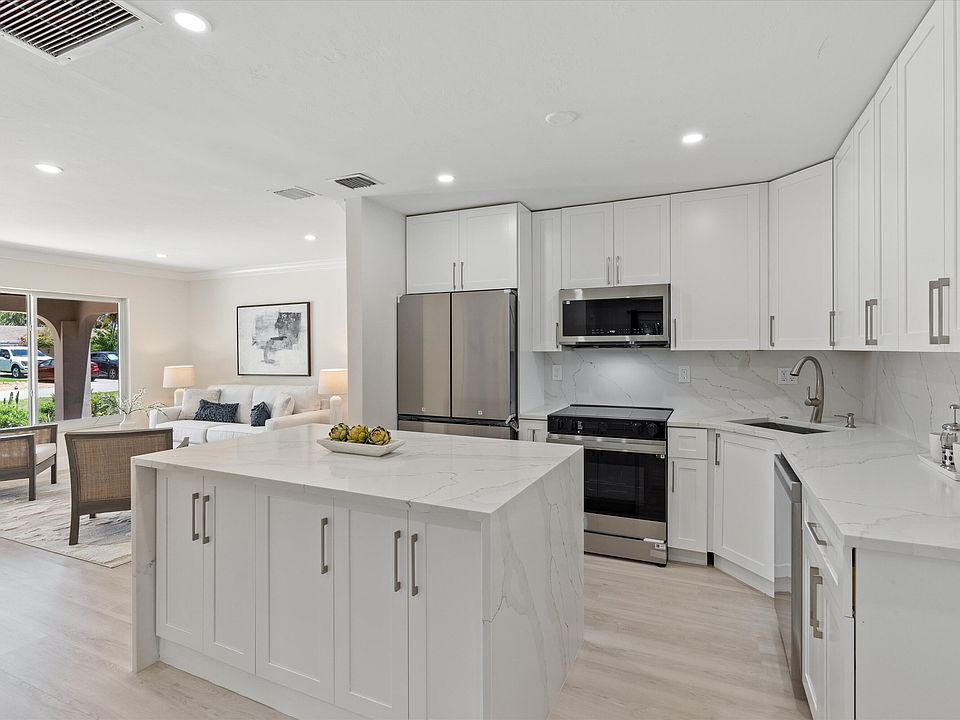 Presenting a unique opportunity in the heart of East Boca on over 1/4 an acre with no HOA. Welcome home to your private oasis, minutes from everything! Offering 4 bedrooms + flex room, 2 baths and an expansive backyard with new landscaping and shed. Step inside to this bright floorplan with flush LED lighting, freshly painted, and new luxury vinyl flooring throughout. New kitchen with quartz backsplash, countertops, island and new SS appliances. The primary suite includes a walk-in closet and a new primary bathroom which includes a glass enclosed shower, double vanity with quartz top, and soaking tub. Metal Roof 2019, AC 2018, HW 2013, 2014. Prime location - walk to Mizner Park, Brightline, beaches and more. Mizner Park and Downtown Boca.