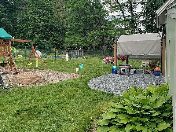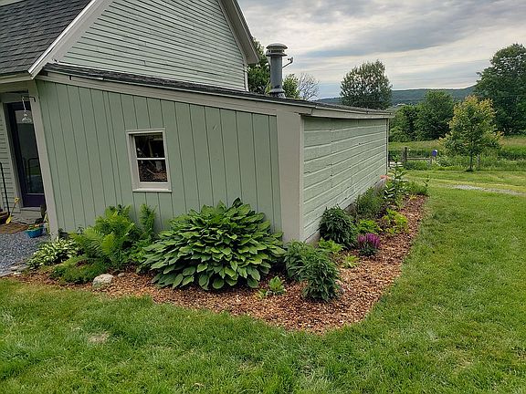 Outside from the front yard/porch you can enjoy beautiful views of Vermont and New Hampshire over the CT River Valley. Perennial flower beds border the house and one car garage. In the back yard enjoy a private oasis/mini-farm that includes a patio, pergola, child’s play set, fenced organic garden and chicken coop.
