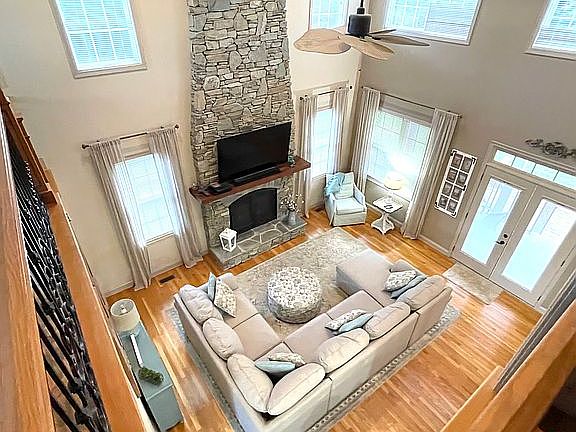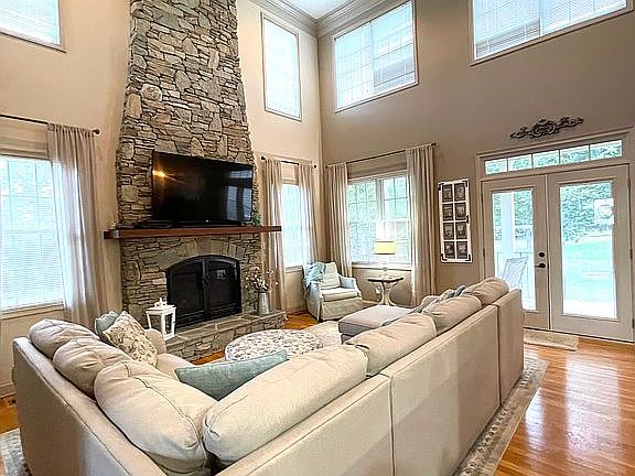 -20 foot ceilings in entry and great room, with floor to ceiling natural stone fireplace.
