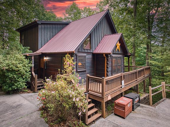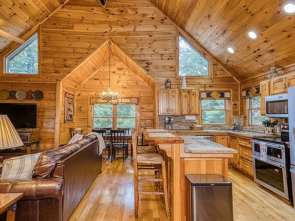 This inviting 3-bedroom, 3-bathroom true log cabin is designed for comfort and privacy, with a bedroom on each level. The master suite, located on the upper level, boasts its own private balcony with stunning mountain views, along with a luxurious ensuite bathroom featuring a custom tile shower, jetted tub, and rustic stone countertops. The main level offers an open-concept living room anchored by a striking stone fireplace, creating a warm and welcoming gathering space. The kitchen is outfitted with sleek stainless steel appliances and matching stone countertops, providing both style and functionality. On the lower level, you'll find a cozy additional living area with its own fireplace, plus game tables for added entertainment. Step outside to enjoy the wrap-around porch on the main level or retreat to the covered lower-level porch, where a hot tub awaits for ultimate relaxation. The highlight of the outdoor space is the expansive party porch, complete with outdoor furniture, a large stone fireplace, and a wet bar—perfect for entertaining or enjoying quiet mountain evenings. With paved roads leading to the property, easy access to town, and beautiful mountain views, this cabin is as convenient as it is scenic. Additionally, the property comes with a strong rental history, making it an excellent investment opportunity. Due to the busy rental schedule, showings are only available on 9/20, 9/23, 9/27, 10/1-2, and 10/6.