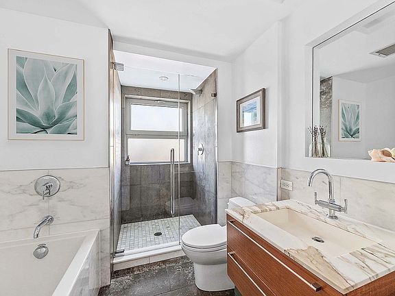 Upon entry you immediately notice the loft-like openness of the apartment and are greeted by an open style floor plan. The expansive, fully renovated kitchen is a true delight for culinary enthusiasts and features white lacquer cabinetry, grey Caesarstone countertops, chic subway tile back splash, a stainless steel appliance package including a Bosch cooktop, wall oven, microwave and dishwasher, 36" Jennair refrigerator and a large peninsula island that accommodates seating for four. Open concept living seamlessly flows from the kitchen to the north facing living/dining room which looks out onto bucolic Powers St. and provides plenty of space as a comfortable haven for everyday living as well as entertaining. Make your way down the main hall and find your generously sized secondary bedroom to the left which easily fits a queen size bed and more and is outfitted with a large closet and is across the hall from the secondary bathroom which features a deep soaking tub. At the end of the hall is a spacious and tranquil king size primary bedroom with double exposures that provides the perfect retreat after a long day. The primary bedroom easily accommodates a desk, dresser and more and features a giant walk in closet for optimal storage. The spa-like primary bathroom boasts Calacatta marble and honed granite tiles, an extra deep Zuma soaking tub with frameless glass partition, separate expansive windowed shower stall, Grohe fixtures and toto toilet. The stacked Bosch washer/dryer is cleverly tucked away in a closet towards the entry of the home and there is also an adjacent coat closet that completes the interiors of the apartment. There is a refinished common roof deck shared by the condominium residences with panoramic views of Manhattan, Brooklyn and Queens perfect for sunbathing, dining al fresco or just enjoying the outdoors.