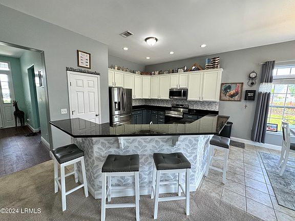 Nestled on a .23-acre lot with serene lagoon views, this meticulously maintained home offers modern comfort & tranquility. Enjoy an oversized fenced yard with a large patio and covered porch. Inside, find an open split floorplan with soaring 10-foot ceilings and a beautiful kitchen with 2yr old appliances! Relax in the spacious primary bathroom with a large jacuzzi tub & separate shower with dual showerheads. Features include maintenance-free stone & vinyl siding, newer HVAC from 2022, & a 2-car epoxy floor garage with added storage. With proximity to Bluffton, Hilton Head, Beaufort, & Savannah, plus low HOA, this sanctuary awaits!
