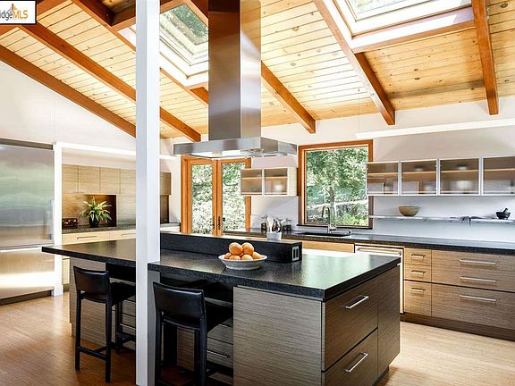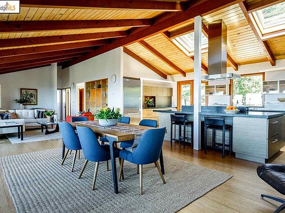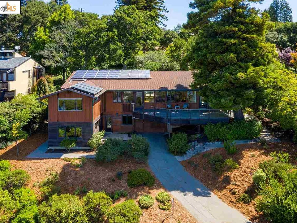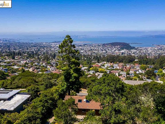 Set in a spectacular park-like setting with sweeping views this Mid-century treasure is one-of-a-kind. A serene sanctuary surrounded by nature with unparalleled San Francisco Bay, head-on Golden Gate bridge and Mount Tamalpais views. Seamless indoor/outdoor connection provided by abundant large windows and glass doors on both levels. Top-level craftsmanship in remodeled custom kitchen with high-end Miele appliances . Thick honed granite countertops and custom-dyed crafted wood cabinets, large skylights and French doors to patio for dining al fresco. Large deck with majestic redwood tree off the dining and living room. Open concept floor plan, cathedral wood ceilings create a warm and intimate environment . Dual-pane Marvin windows beautifully frame views of the elegant garden, dotted with California native plants, and sophisticated hardscape. Professionally-designed grounds, in sync with nature. Nearby paths to Tilden and Wildcat Canyon, Hilltop School and near commute bus to BART.