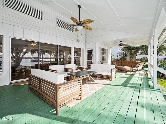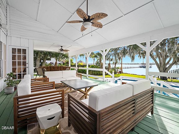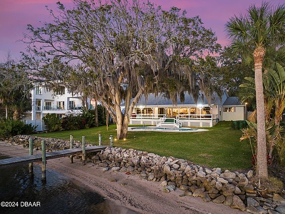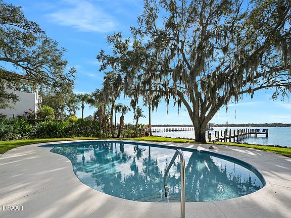 Simply Exquisite. Perched high on the banks of The Halifax River and nestled beneath the ancient oak hammock that frames Volusia County's most desirable address, this home leaves nothing to be desired with undeniable charm inside and out. Approach the front door to find hints of a ''Southern Living'' centerfold where a covered front porch is supported with handsome traditional columns over a long brick patio. Enter the front door to be immediately greeted with views of the water as the open floor plan creates the perfect waterfront setting with living and dining areas that are defined yet open to each other. A spacious island kitchen is appropriately appointed with white shaker cabinets and topped with granite to create the perfect workspace for the chef without sacrificing any of the fabulous views. Three of the four gracious bedrooms have water views with the primary suite occupying its own private wing featuring a wall of windows overlooking the water, a cavernous walk-in closet and a luxurious bath. Step outside onto the fabulous riverfront lanai and experience the ultimate outdoor living room. This sprawling covered space was designed to sit high above the water to capture river breezes and provide plenty of shade. This is the ideal space to entertain a crowd or relax with loved ones. Just below, a sparkling blue, free form pool sits beneath a stunning old growth oak tree that shades the enticing water on a summer 's day. A sturdy dock with boat slip was constructed by the highly regarded Leggett family of Custom Built Docks to the highest standards. The original structure of this home was built in 1955 however a subsequent owner expanded the vintage bungalow to encompass the lovely layout presented today, without sacrificing any of the original charm. Hardwood floors stretch throughout and plenty of natural light illuminates the handcrafted built-ins and extensive trim carpentry. Other conveniences include an indoor laundry room and a tremendous storage loft that spans the entire length of the home, which might be the ideal spot for additional living space in the future. Truly a fabulous property on coveted "One Way Riverside Drive" just two blocks from the iconic Casements Community Center and splendid Rockefeller Gardens. Three blocks to the beach and within walking distance to trendy eateries/pubs, shopping and Oceanside Country Club. This is arguably the most sought after riverfront address in this part of the East Central Florida Coast.