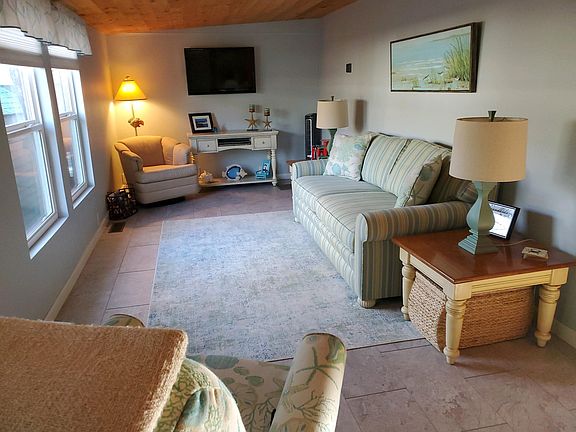 Fantastic 2 bedroom unit that has been completely redone 8 years ago, down to the studs and insulation. 2nd bedroom is a large bunk room that is nice and bright and has a window for even more light. Full size range with microwave above it, granite counter tops, SS sink and beautiful cabinets. Large hall closet used for pantry and linen closet, Decent size bathroom with full size tub. This unit is move in ready and fully stocked. Great furnishings included. Awesome screened in porch with storage attic. 3 storage sheds included as well.
