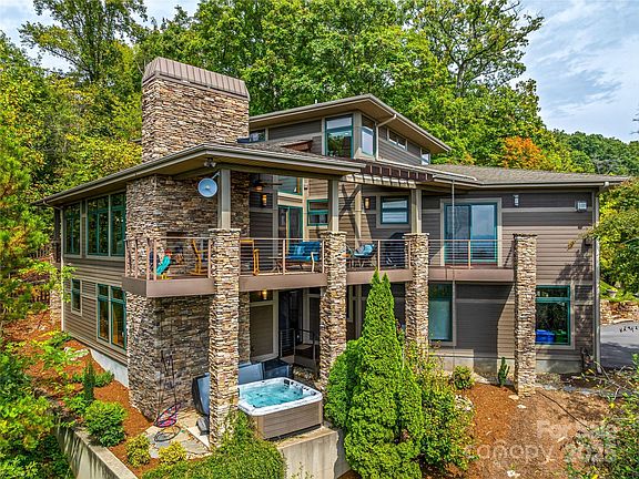 Exceptional home on Reynolds Mountain with long-range southwest views from nearly every room. Offering “top of the mountain views without being on top of a mountain,” this 4BR/3BA/2HB residence features 4,664 SF of thoughtfully designed living space with floor-to-ceiling windows that capture the mountains. The main level showcases an open living, dining, and kitchen area with custom cabinetry, multiple pantries, and seamless flow to outdoor spaces. A covered deck off the dining room connects to a fenced area, while the expansive back deck with durable Ipe decking includes a wood-burning fireplace and space for dining and entertaining. A separate patio with hot tub provides another private retreat to enjoy the views. The main-level primary suite offers sweeping views, a spa-like bath, generous walk-in closets, and a conveniently located laundry room. A second primary suite is located on the lower level, offering privacy and comfort for guests. The second level includes additional bedrooms and a bonus living space, each with its own mountain outlook. An oversized two-car garage provides ample room for vehicles, outdoor gear, and storage, all with direct access to the home. Just blocks from the , dining, and shops at Reynolds Village, this North Asheville location combines convenience with the privacy and views that define the Asheville lifestyle.