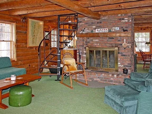 Quintessential and fun three-bedroom log chalet on Okemo Mountain. If you have been looking for an affordable, easy-to-maintain ski home retreat with warmth, charm and character, this is it. Enter the first floor into a mudroom/ski room area with wood stove. A bedroom and full bath complete this level. Spiral staircases connect the top two floors. The open design second floor features a kitchen/dining area and a living room, separated by a brick fireplace. Wrapped in windows looking out into the hemlock trees, this level opens to the covered porch on the front of the home, and a deck off the kitchen offering a handy second entry. Two bedrooms and a bath are on the top floor. A perfect, charming retreat!