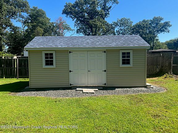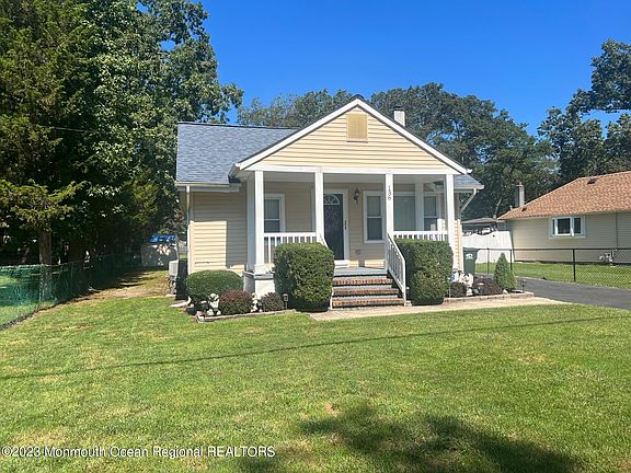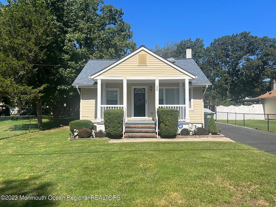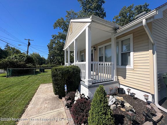 CURB APPEAL GALORE! This charming rancher is the perfect starter home or great for those looking to downsize! Location is excellent right off Rt 9 close to 195 East and West. Lovely front porch, beautiful beveled storm door enters into office or third bedroom on the left; Living room to the right. Newer carpet and neutral cream colored paint. Dining room and eat in kitchen have white ceramic tile flooring. Did I mention white kitchen cabinets!? Super clean. Two more bedrooms with closets, one full bath, laundry room that goes to the back deck. House was converted to public water and sewer. Long driveway for parking oversized vehicles. 3 year old roof is a blue that matches the roof of the large Amish built shed in the level backyard! Property is offered ''as is''. Seller will provide CO