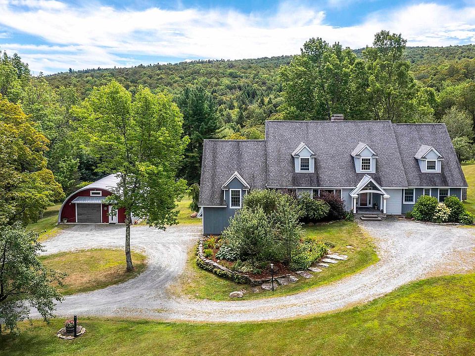 This is the perfect Vermont getaway, private and secluded, minutes from skiing, restaurants, and all the charm of Southern Vermont. This property is truly special, set on landscaped grounds with rolling meadows, a small, renovated barn with deck, and a 30x40 insulated Q Building with heat, water and 220 amps, as well as a whole house generator. The location is choice: close to world-class skiing yet offering a peaceful country feel. A 47x22 deck and a covered porch are both perfect for soaking in the sweeping views of the mountainside and manicured grounds. The home delights with sun-filled rooms and hardwood floors. The entry features radiant tile heating, a cathedral ceiling, and an open staircase leading to the second level that has three large bedrooms, one with its own en-suite bathroom. There is also a large landing area that allows for a sectional sofa and TV area. On the main floor, the great room boasts a vaulted ceiling, pine flooring, ceiling fans, and a projection system with screen. The wonderful kitchen/family room offers a brick fireplace, granite and marble counters, glass-front cabinets, a walk-in pantry, and patio doors to the breathtaking views of the deck with adjacent wet bar with a granite-topped sink. The first-floor primary suite offers a brand-new spa-like bathroom, creating a private sanctuary with plenty of room in the new oversized walk-in closet. The lower level includes a versatile studio space, perfect for many hobbies.