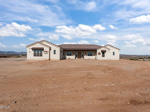 Welcome to this beautiful 3-acre property in Wickenburg, just minutes from town! This 3,200 sq ft custom-built home offers 4 bedrooms, 3.5 bathrooms, a powder room, butler's pantry, office, and an open floor plan with split bedrooms. The home features stained concrete floors, granite countertops, and plenty of windows to soak in the surrounding mountain views. Enjoy the convenience of a private entry off the master suite and a guest room, plus a 4-car garage with storage room and overhead storage. Step outside to the expansive 14 ft covered patio, perfect for relaxing or entertaining.A pad is already in place for extra parking, a shop, or horse facilities. Additional acreage across the road is also available for a full horse setup. The property comes with a shared well (3 shares total) and is located within the Wickenburg city limits for easy access to town. If you're looking to have family close by, the neighboring property is also available, plus there's additional acreage across the road an ideal spot to build an arena or set up a horse property to enjoy with family and friends.