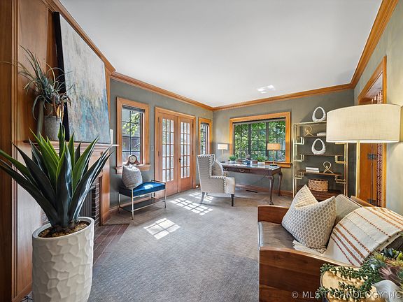 Lovely Travis Heights Historic home on over-sized lot near the Garden Center. Restored and preserved with attention to original detail. Gorgeous rock exterior with brick drive and stone walk. Rich butternut wood trim flows through the home with arched doorways, built-in bookcases, and desk. Remodeled kitchen with Craftmade Cabinets, gorgeous granite & tile backsplash, huge pantry and built-in breakfast nook with storage seat. Spacious downstairs master suite features soaring ceilings, electric blinds, separate walk-in closets, soaking tub, double vanities, and heated tile floors, There are 6 fireplaces throughout the home. Three spacious bedrooms up with large walk-in closets and bonus work-out room or additional office space. Rich hardwoods flow up the stairs through all the bedrooms. Finished basement is 590 feet with wood burning fireplace. Incredible landscaping surrounds the home with breath-taking perennials. The outdoor entertaining area features a large covered flagstone patio and walkways, fire pit, she-shed and raised planting beds. Claire Ashby was the Landscape Architect & Kleinco did the master suite add on. Within minutes of Utica Square, Woodward Park, and Philbrook. Must See!