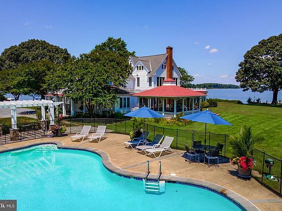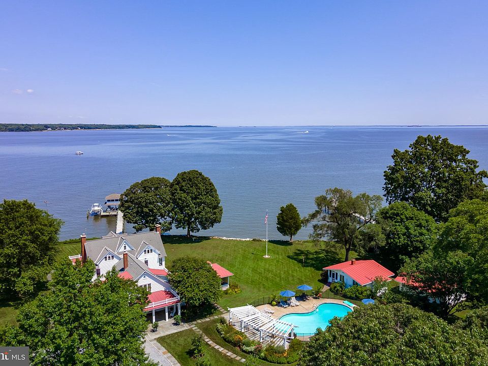 McKinley Point is a remarkable estate on more than 5 acres featuring panoramic views across the West River to the Chesapeake Bay from every room. Ideally situated on a peninsula with 460 feet of water frontage, this stunning and refined property has it all: A waterside pool; a guesthouse; a dock with a two-story gazebo and boat lift; a screened-in porch with stunning water views; and a three-car garage. The home’s wide and elegant center hall entrance welcomes you with dramatic river views, arched doorways and pristine, oak floors. Each elegant room flows beautifully to the next, making it a perfect place for relaxing as well as entertaining. The heart of the home is a spacious, renovated kitchen with a large breakfast room. Its masterful design includes coordinated granite countertops, a gas fireplace, a bar with a wine cabinet, refrigerated drink drawers, and a custom wooden plank ceiling. The family and the living rooms are mirror-images with classic custom mantels and newly rebuilt fireplaces (one gas and one wood burning). An extraordinary great room with breathtaking views features waterside dining, sitting/reading areas, a billiard room and surrounds the formal dining room for intimate gatherings. The amazing primary suite includes a renovated marble bath and a private office with phenomenal views. Each of the bedrooms, five of which are ensuite, enjoy magnificent water views. This very private property is surrounded by beautiful lawns and planted with lush, native gardens and lovely trees. It once had its own small golf course. McKinley Point's location at the mouth of the West River makes boating the Central Chesapeake a dream and allows an easy trip to points North like Historic Annapolis and the scenic Severn River. Shoot directly across the bay into Eastern Bay and all that Kent and Talbot Counties offer including day trips to St. Michael’s and Oxford. Closer to home lies the Rhode and West Rivers for protected anchorages and dockside dining at several waterfront hotspots in nearby Galesville. Shady Side is a quaint, charming location conveniently situated for traveling or commuting to Annapolis (about 30 minutes), and DC (about 45 minutes).