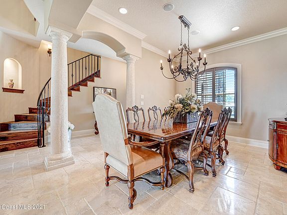 Live the ultimate Florida lifestyle in this luxurious custom built home! Easy boat access to the Atlantic Ocean and the Intracoastal Waterway. Covered dock with a 12,000 lb. boat lift. Port Canaveral is just around the corner. Orlando with all it's attractions is 45 minutes away, along with the Orlando International Airport. Bulkhead with 300 ft. frontage on Sykes Creek and wide canal. Elegant tumbled marble floors, soaring ceilings, hurricane impact windows and solid doors throughout. Lovely stone gas fireplace for cool nights. Master bath with double alabaster sinks. Jetted tub for relaxing. Stunning wooden stairs lead to the loft/bonus area. Spacious laundry room and oversized garage. Attic is finished out for storage. New roof in 2021. Call today to view this magnificent home!