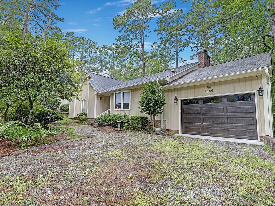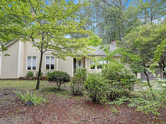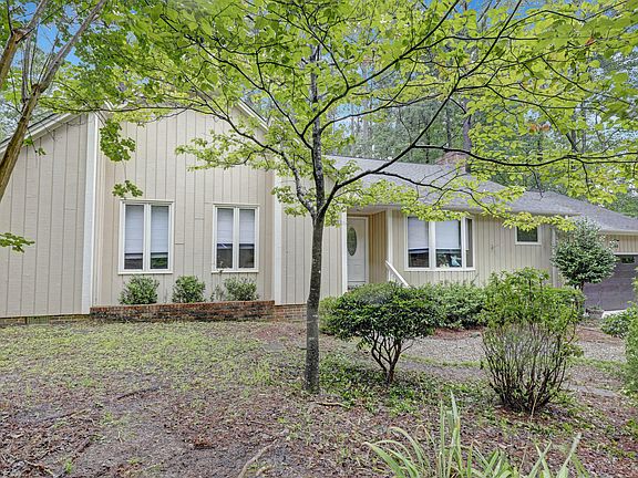 MOTIVATED SELLER! $30k price improvement! Price and terms only available on offers through 10/4, 9am. Renovated 3 bedroom, 2 full bathroom home in Carolina Trace community along Lake Trace! Situated on almost a quarter of an acre, the one level residence offers a cabin-like feel with vaulted ceiling and exposed beams, fireplace, built-in bookcases and hardwood flooring throughout main living areas. A gorgeous natural wood paneled sunroom with large windows allows for plenty of natural light. Carpeted bedrooms all equipped with ceiling fans, plus primary offers walk-in shower. Attached garage and long driveway provide ample parking and lush foliage provides plenty of privacy ideal for relaxing or entertaining on the spacious deck and patio. New doors, garage door, new top-quality carpets, and all new Maytag/Samsung appliances. The kitchen tiles have been replaced, and the entire house has been repainted. Must see!