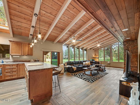 This Serene and peaceful home on Aspen Valley Golf Course offers an unparalleled Flagstaff living experience with breathtaking views. The open floor plan and vaulted ceilings create a spacious and inviting atmosphere, perfect for entertaining or simply relaxing in the tranquility of your own own home. The skylight-filled kitchen is a chef's dream, complete with gas cooking, ample counter space and pendant lighting.