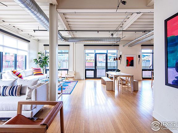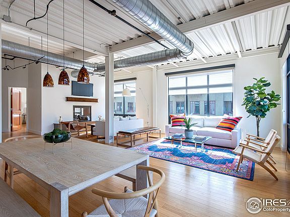 Modern 2 Bed/2 Bath Luxury Loft in the heart of Downtown Boulder. Light and airy open floor plan loft with 12-foot ceilings! Incredible natural light pours into the unit from large floor to ceiling windows, providing views of the foothills and Mt. Sanitas. Spacious and private large west-facing patio off of the kitchen. Double-sided Fireplace in Living Room & Primary. Boulder's best restaurants, shopping, farmers market, bike paths and Pearl Street Mall right out your door. This lock and leave unit comes with 2 private, heated and secured parking spaces & large storage area. End / corner Unit in excellent condition. Downtown Boulder living at its best.