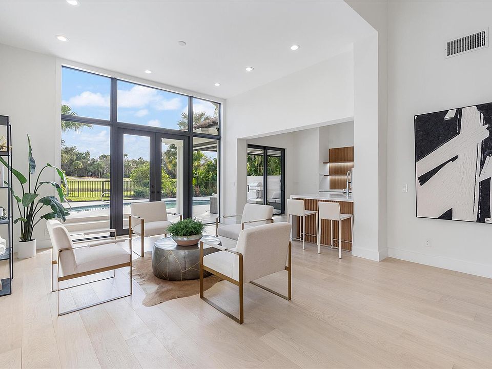 Exceptional newly renovated paradise situated on private triple fairway lake views with southern exposure in exclusive Frenchman's Creek Community. The newly renovated light and bright 3 bdrm, 4.1 ba, office/4th bedroom, 2.5 car garage, white oak floors through out this open floor plan with spacious great room, dining and kitchen offering views to the beautiful water golf vistas. New impact glass, AC, water heater, New flat tile roof, newly painted inside and out, new Kitchen, Baths, LED lighting, Appliances, light fixtures, garage floor, central vacuum, pool equipment and much more. The large first floor primary suite boasts 2 primary baths, ample closets and peaceful private views