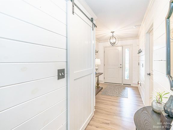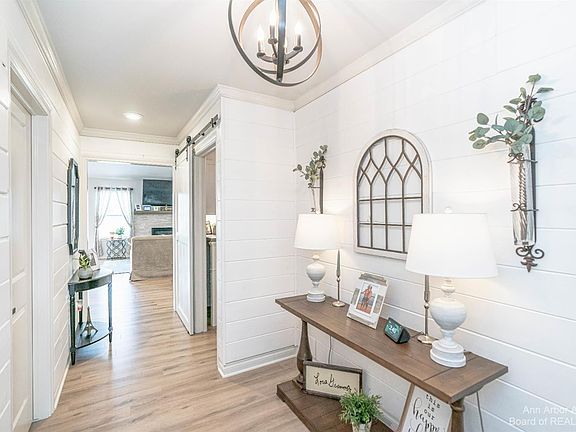 Only 2 years old, perfection is the only way to describe this bright and open 3 bed/ 2 bath ranch in Country Walk of Van Buren! Upon entering the front door, you are greeted w/ a crisp shiplap foyer leading to the incredible kitchen w/ an entertainer's island, white cabinetry, quartz countertops, stainless steel appliances, designer vinyl plank flooring, and vaulted ceiling opening to the spacious Great Room w/custom built gas fireplace. Other highlights include. Primary Bedroom Suite w/ tray ceiling, walk in closet, and private bath w/bay window, dual vanities, granite countertops, and spa sized tiled shower w/Euro door. The two additional bedrooms on the other side of the house share a full bath with tub/shower combo and granite countertop. Custom 1st floor laundry w/barn door, built in cabinetry, shiplap walls, and folding space. Stunning par. fin. LL w/wet bar, daylight windows, media room, and an additional 800 sq.ft. of finishable space that is plumbed for a future bath. Landscaping only seen in Better Homes and Gardens w/paver patio and built in fire pit w/view of the pond. Attached 3 car side entry garage w/10 foot door that is perfect for your boat. Low township taxes. This home is a masterpiece!, Primary Bath, Rec Room: Finished
