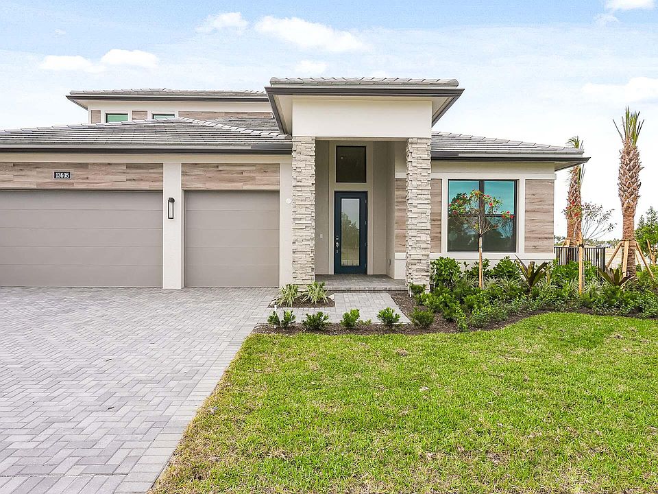 **New Construction - Move In Ready** This brand-new Paige floorplan built by Kolter Homes is located within the gated community of L'Ambiance at Avenir. This home includes 4 bedrooms 4 bathrooms, in which the 4th bedroom and bathroom are a 2nd floor bonus option. This Paige also includes a 3-car garage and a 16' wide by 10' tall sliding impact glass door leading to the lanai. The owner's suite includes the deluxe shower with free standing tub option, and the flex room has been converted into a study with double doors. There is a gas connection for a future pool heater, as well as a 5' privacy wall on the lanai with gas, electric and water connections for a future outdoor summer kitchen, and the backyard offers ample room to build a custom pool. The kitchen includes a quartz island countertop with a waterfall edge and second tier upper cabinets, and the great room has an added electric fireplace.