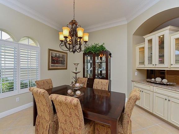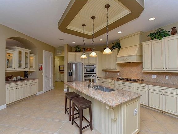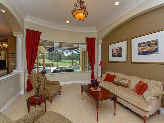 A stunning exterior creates a stately expression of elegance. Upon approach, the stylish circular drive & lush landscaping set the stage for the deluxe interiors, before designer etched front doors open to reveal breathtaking golf course views. Exquisite architectural details, ceiling treatments & crown moldings embellish the 3500 sf of living area from grand tuscan columns & double coffered ceiling in foyer entry to the magnificent tray ceilings in kitchen & family room. The gourmet kitchen presents the very latest in quality design w/a large granite center island w/wainscoting, staggered latte wood cabinetry, stainless appliances, butler pantry w/glass fronts, designer backsplash, decorator range hood, under counter lighting, pantry, & sun filled breakfast area w/window seat. Disappearing sliders in family room open gracefully to heated salt water pool & spa w/pavers & outdoor kitchen, all enveloped by spectacular golf course views; the perfect setting for entertaining. You will look forward to ending each day in the luxurious master suite w/coffered ceiling, his & hers suited closets & French doors to lanai. All guest bedrooms including the den/5th bedroom feature window seats. Head upstairs to bonus room w/wainscoting & sliders to balcony w/pavers where an amazing golf course view awaits. Other features include: elegant tile details, central vacuum, alarm system, recessed lighting, oversized garage, 2 laundry sinks, exquisite fans, light fixtures & window treatments, also wired for surround sound.