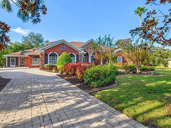 Set on a beautifully manicured homesite surrounded by mature palms, sculpted hedges, and vibrant landscaping, this extraordinary residence feels like a world of its own—quiet, refined, and thoughtfully designed for those who value beauty and privacy. A stately brick and stone façade with arched windows and double French-style doors sets the tone for the luxury that unfolds inside. Upon entry, sparkling crystal chandeliers cast a soft glow across custom crown molding that carries throughout the home. A gorgeous fireplace with a custom mantle offers an instant sense of warmth and welcome. The main living area rises dramatically with two-story ceilings, rich wood paneling, curated wall inlays, and a built-in aquarium adding a sense of movement and serenity. A striking staircase with wood treads and white spindles becomes a sculptural element, while arched niches, custom built-ins, and granite surfaces enhance the room’s timeless character. The kitchen opens effortlessly to the living space, designed with both everyday comfort and entertaining in mind. Granite counters stretch across multiple prep zones, complemented by warm wood cabinetry, stainless steel appliances, and a raised breakfast bar. Pendant lighting and designer details create a sophisticated environment where gathering feels natural. The primary suite is an intimate retreat featuring a floor-to-ceiling stone fireplace, a cozy built-in reading nook, and his-and-her closets. The ensuite bath offers a spa-like experience with a deep soaking tub, custom tile work, a makeup vanity, walk-in shower, and a radiant crystal chandelier. Bedroom Two is hidden behind a seamless paneled wall—an ideal secret library, reading room, or creative hideaway. Upstairs, a bonus room or 5th bedroom has full bath, closet and a private balcony overlooks the serene grounds. The screened lanai feels like a personal resort. A shimmering pool, stone-accented spa, and peaceful greenspace views create a tranquil setting, while the fully equipped outdoor kitchen—featuring a KitchenAid natural gas/propane grill, Lynx stovetop, mini fridge, and double sink—makes entertaining effortless. An attached guest suite offers full independence with its own entry, garage, and alarm system. Inside, ceramic tile flooring, detailed crown molding, and stainless steel LG and Whirlpool appliances (including washer and dryer) elevate comfort. The suite includes a massive walk-in closet, custom-built headboard, granite counters, white cabinetry, and a spacious screened porch that opens to a private deck overlooking the backyard and pond. Throughout the home, thoughtful details shine—plantation shutters, French doors, intricate woodwork, designer lighting, and abundant natural light. This residence is rich with warmth, character, and luxury—ready for its next chapter.