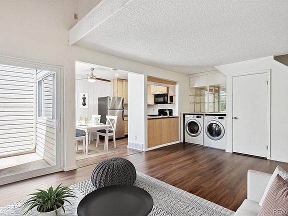 Move right into this updated end unit two story condo. Large, spacious open floor plan on the main. Large living room with wood burning fireplace that features sliding doors leading out to nice patio area that is great for bbq. This patio area can be enclosed for more privacy or pets. Per the HOA you can enclose the patio to be an egress or full enclosure. You can view other units in the complex that have done this. New laminate wood flooring throughout. Kitchen with eating space features newer appliances, cabinets & countertops. Full size washer & dryer are also included. Large main floor bedroom with nice size closet + full bath. Upstairs the seller has walled in the loft area to make a nice private primary suite with closet +attic space for additional storage. Sliding doors off the primary suite lead out to private patio which is perfect to enjoy morning coffee. Fully, updated spacious primary bath. Newer roof, siding & windows. Furnace & A/C replaced in 2017 and water heater is 5 years old. One covered carport space + plenty of surface parking. Steps to the clubhouse and pool. Close to light rail and easy highway access.
