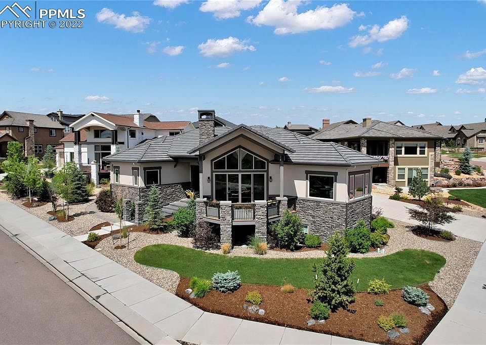 This stunning, custom-built home was thoughtfully designed to maximize the Pikes Peak View from several expansive windows throughout the home. The main level offers a well-equipped kitchen with stainless steel appliances, 6 burner gas stove, a large pantry, custom cabinetry, granite counters, and beautiful hardwood floors. A large island with ample seating opens up to the living area and dining room, perfect for entertaining. The owner's suite is replete with a walk-in closet and 5-piece master bath and the second bedroom on the main level is the perfect place for a guest room or home office. Walk down to the basement and find an open living area with a fireplace, wet bar, and large windows that let in an abundant amount of natural light. There is a large junior suite in the basement with a walk-in closet and attached bathroom. The enclosed patio features an endless pool fitness system, space for exercise equipment, and walks out to a private patio with a fireplace. The backyard is just the right amount of space and features a putting green, built-in trampoline, and basketball hoop. A nicely finished mudroom walks out to the garage that includes two finished storage closets, one with an electronic combination lock. With too many custom finishes to list, this home is a must-see. Located in the Village of Verona in Flying Horse and within walking distance to Discovery Canyon Campus, this location is ideal. Flying Horse is a golf course community located in one of the most desired areas in Colorado Springs. For an extra fee, you can join the Flying Horse Club and enjoy tennis, golf, pickleball, basketball, several pools and hot tubs, restaurants, and social gatherings with your neighbors.