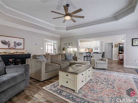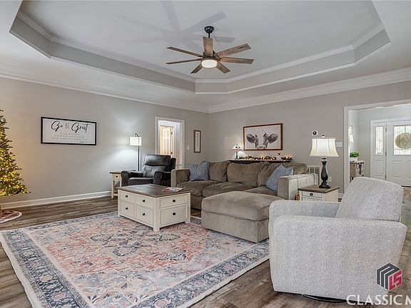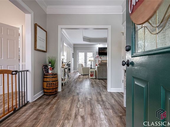 Welcome to your serene retreat in Silverleaf, Watkinsville, GA! This exquisite 4-sided brick ranch home with 3-car garage boasts a picturesque front yard that exudes tranquility and charm. Nestled among mature trees, the front yard offers a canopy of shade creating an autumnal ambiance perfect for cozy evenings or a peaceful morning coffee. Located in the desirable Silverleaf community, this property offers the perfect blend of privacy and community, with ample space for outdoor activities or simply enjoying nature. As you step into the spacious entryway, youre greeted by beautiful luxury vinyl plank floors that lead you into the heart of the house. The room the the left offers an ideal office or dining room, featuring the grandeur of vaulted ceilings that add an airy, expansive feel to the room. The high ceilings not only enhance the rooms aesthetics but also allow for creative lighting fixtures or elegant chandeliers that can set the mood for both work and dining. The large windows invite an abundance of natural light, creating a bright and welcoming atmosphere perfect for productivity or hosting dinner parties. The LVP floors add a touch of sophistication and warmth, making the space cozy yet refined. The family room features LVP floors and is illuminated by a ceiling fan with a light fixture. The open floor plan extends into a dining or kitchen area, with neutral wall colors and decorative elements. This modern kitchen features all-white cabinetry with sleek hardware, providing ample storage space. The centerpiece is a L-shaped breakfast bar with a leathered granite countertop. Stainless steel and white appliances, including a double oven and a large refrigerator, are seamlessly integrated. The owners suite on the main floor is elegantly designed, and is illuminated by a ceiling fan with a light fixture, and natural light pours in through multiple windows, enhancing the serene ambiance. The carpeted flooring adds to the rooms coziness, making it a perfect retreat for relaxation. The renovated bathroom in the owners suite is luxurious and modern, featuring a spacious glass-enclosed shower with a built-in bench and adjustable showerhead. Adjacent to the shower is a freestanding soaking tub, placed under a large window with blinds, allowing for natural light to fill the space. The room is completed with elegant tile flooring and walls, complemented by a double vanity with sleek black fixtures, offering both style and functionality with modern design with a double vanity featuring dark cabinetry and a light countertop, complemented by two rectangular mirrors with contemporary light fixtures above. The remainder of the house is thoughtfully designed to cater to various needs, featuring a renovated half bath and a full bath, ensuring convenience and comfort. The home includes two full bedrooms, offering ample space for family or guests. Additionally, there is a versatile third room that can be adapted into a playroom, second office, or media room, providing flexibility to meet different lifestyle requirements. The backyard features a spacious deck, recently painted. Adjacent to the deck is a cozy fire pit area, surrounded by gravel , creating an inviting spot for gatherings. String lights are draped around the deck and yard, adding a warm, festive ambiance to the outdoor space. The remaining part of the backyard transitions into a wooded area. The backyard is enclosed by a fence that runs along the perimeter, providing a boundary between the property and the dense forest area beyond. Discover your ideal home in Oconee County, GA, where top-rated schools meet proximity to The University of Georgia.