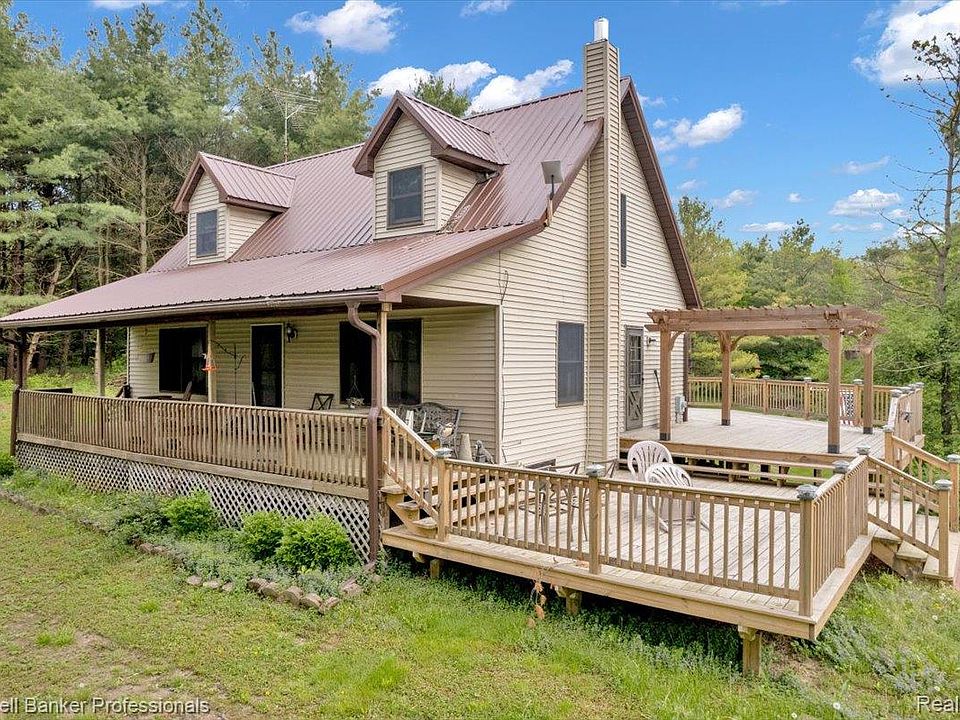 Tucked away on 10 wooded acres, this unique property offers the perfect blend of privacy, nature, and comfort. A long, winding driveway leads you past a beautiful pond system to a charming 4-bedroom, 2-bath home surrounded by trees and wildlife. Enjoy peaceful mornings and quiet evenings from the wraparound porch. The home features a metal roof, walkout basement, and plenty of space to relax or entertain. All appliances are included, a wood-burning stove in the basement, an owned water softener, and a single-point reverse osmosis system for drinking water.