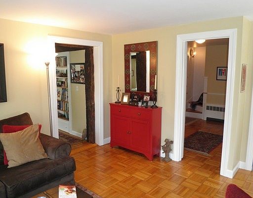 Very spacious, light filled rooms offer great flexibility of use. Fully applianced kitchen includes stacked washer and dryer for your convenience. Charm and character abound with beautiful parquet wood floors, french doors, and antique details. Private deck and yard area will beckon you to relax. Just steps away to Verrill Farm and all it offers. Super location and close access to commuter routes.
