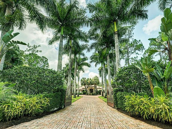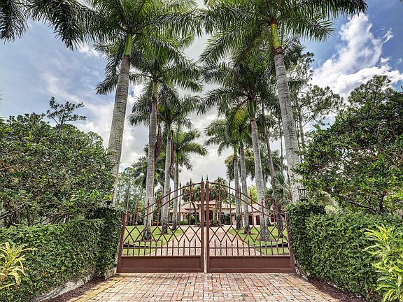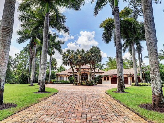 Grand 5 bed, 4.5 bath Mediterranean estate on 5.25 acres. Enter the private gates and drive along the swaying Royal Palms to the beautiful Porte Cochere with Pecky Cypress and Spanish tile accents. 4,464 SF integrates the highest quality custom features with all the outdoor attributes you desire in a country setting that is just minutes to the best of Northern Palm Beach County. Appointed with travertine marble floors and 15' vaulted ceilings the open concept living area designed for modern living. The spacious Living and Dining rooms feature high, decorative ceilings. The Kitchen is a Chef's dream with custom pine cabinetry, granite countertops, brick accents in the backsplash and tray ceiling in-lays, DCS gas range, Viking refrigerator, and a wine cooler. CBS +Impact windows and doors