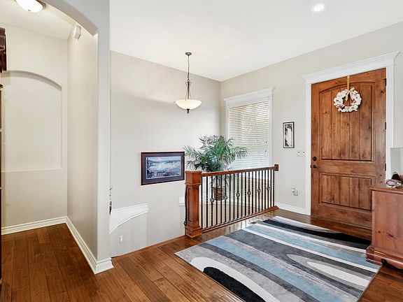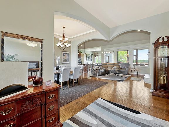 Stunning ranch home situated on a very desired lot, with agricultural views and tree lines from the backyard setting. Enjoy wildlife pictures in the early morning and evening. Admire this grand entrance into this open and classic floor plan. A spectacular foyer with a dramatic spiraling staircase, formal dining, and hearth room with gorgeous built-in bookcases, that have plenty of storage, and gas fireplace to enjoy those cozy evenings. The kitchen invites gatherings at the eating bar and island, plenty of storage space in the pantry, and steps away to the second eating area leading through double doors to the covered, screened in composite deck, with a cozy gas fireplace. Convenient oversized drop zone off the garage and separate laundry room for everyday life! A split bedroom plan with walk-in closet space in each bedroom, that are also all lighted to find the items easily. The master bath displays a corner tub, two sink vanity, and tiled shower! There are 9ft ceilings in the lower level rec/family room, a wet bar with great storage, space for separate future wine room or pantry, a gas fireplace, a walk out basement that leads to the wrought iron fenced yard, two more extra bedrooms, and full bath! This home will not disappoint.