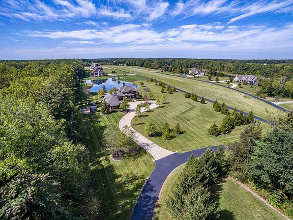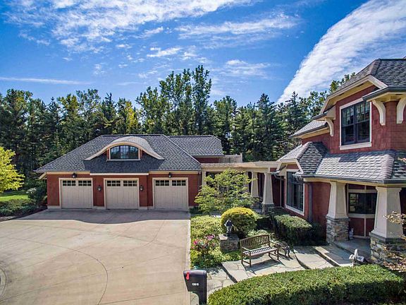 Private 3.7 acre estate includes a spectacular 5 bedroom, 9 bath home w/finished daylight basement, 3 car garage w/studio apartment, plus scenic pond & access to the development greenspace & functioning air strip. A multitude of generous windows & French doors to access decks & patio areas fill this home with natural light & provide scenic views. Stylishly elegant finishes throughout include specialty light fixtures, custom tile, quality millwork crown molding, coffered ceilings, raised panel wainscoting, hardwood flooring, built-ins for storage organization, pocket doors, iron stair rails & multiple fireplaces. Light & bright gourmet eat-in kitchen is equipped with an abundance of floor to ceiling white cabinetry, tiled backsplash, contrasting island, bay window over the farmhouse style sink, under cabinet lighting, a huge butlerâs pantry, plus appliances worthy of a trained chef remain. A double sided floor to ceiling stone fireplace defines the separation from the kitchen hearth area to the living room. A formal dining room has 2 walls of windows & deck access for ease of entertaining. Luxury main floor master suite has a private deck, 2 walk-in closets, plus ensuite bath has freestanding soaking tub, his & her marble vanities, a makeup station & walk-in shower. Laundry/mudroom offers handy built-ins, a shelved storage area, plus utility sink. Upstairs are 4 bedrooms & 3 full baths. Quality finishes continue to the lower level created for entertaining with an expansive family room, a complete kitchen that incorporates every appliance for easy prep & cleanup, a bar, a wall of cabinetry for storage, a game/play/office area, plus a full bath. An oversized 3 car garage has a finished interior, cabinetry, sink, workbench, banquette dining/meeting area, a full bath, office area, plus a 2nd story completely finished w/kitchen, full bath & private stairs, perfect for a home run business, studio or multigenerational living. Exterior elements include a tree lined circular driveway, slate hardscaping, gas lanterns, multiple decks, 2 sheds, plus a cemented basketball court (no hoop). Architect Dick Terwillinger & architectural designer Frank Souder. Quiet private location yet convenient to dining, shopping, hospitals & easy highway access.
