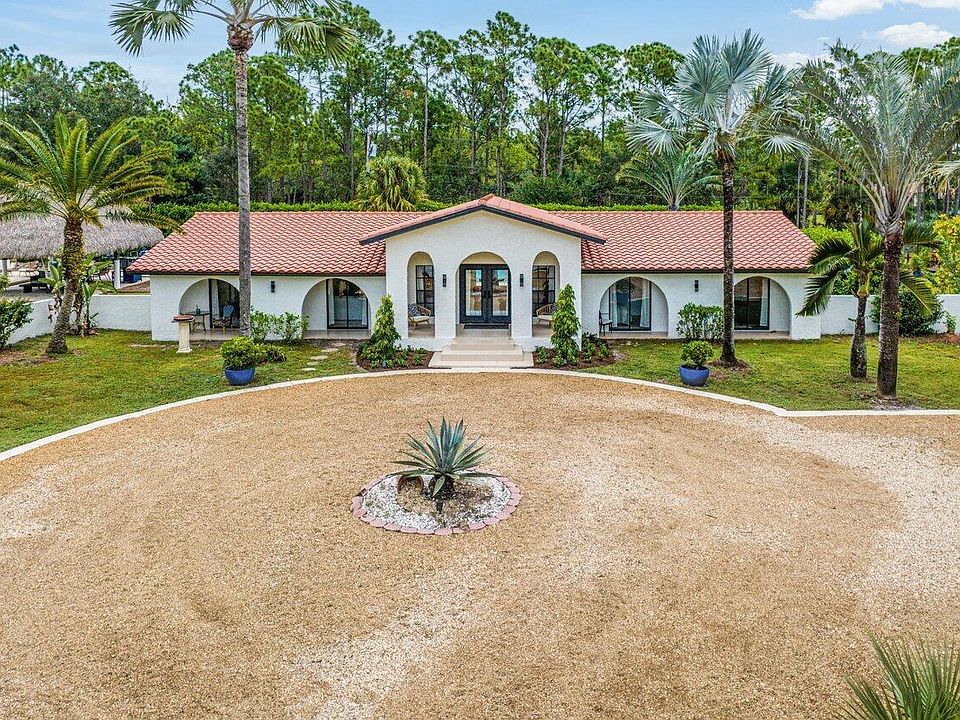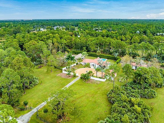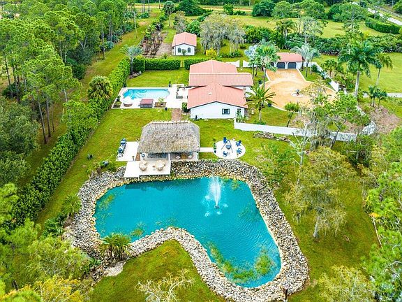 Serenity & privacy on expansive 5 acre gated estate w/privacy hedge. Rent includes pool & landscaping. Hacienda style 4 BR, 3BA home w/high ceilings, crown molding, remodeled oversized kitchen (thick counters, wine cooler) & spa-style primary bath. Available furnished or unfurnished. Raised garden beds to create organic produce. Desirable location close to community entry & 30AC equestrian area. Numerous outdoor living spaces: tiki hut, pool, hot tub, fire bowl, hammock, private lake w/waterfall. Former barn is a large open space (water, electric, lighting), Landlord open to barn modification at Tenant's expense. Detached 3 car garage & oversized circle motor court. Just off PGA, close to park w/tennis & private airport, PGA National, fine dining, & state-of-the-art medical facilities.