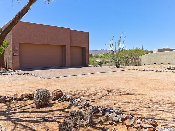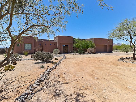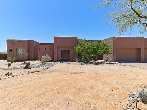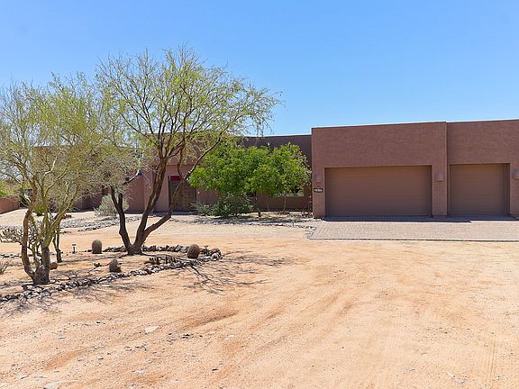 Quiet Rio Verde foothills of North Scottsdale hosts a custom Santa Fe home with 360 degree panoramic mountain views and amazing sunrises, sunsets, hiking and horse trails right at your door. This five-bedroom, single-level, split floor plan shows a large circular driveway that brings you through rustic gates into a secluded courtyard. Upon entry 10-foot ceilings, a formal living room, formal dining room and a cook's kitchen create the perfect atmosphere for the guests and fellow residents alike. The kitchen also features a luxury cooktop, custom cabinetry and a walk-in pantry. The Great room extends to an extra large patio overlooking a tiered back yard with flowerbeds and views of Multiple Mountain Ranges. A spacious Master bedroom and Master bathroom, complete with an extra large walk-in shower, separate garden, tub double sinks and a walk-in closet creates your own personal, spa-inspired retreat. The home consists of 2x6 construction and also includes recessed lighting throughout, as well as a three-car garage...all situated on 1.35-acre lot.