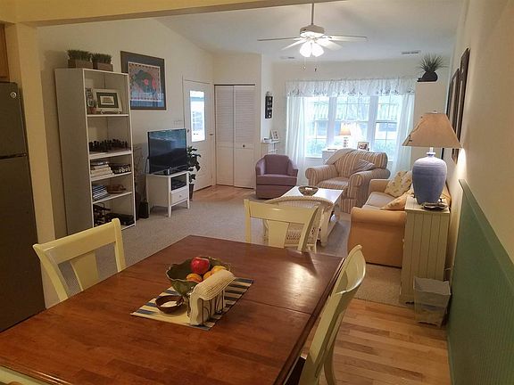 2 full bathrooms in this modern court side updated quad with vaulted ceilings, updated kitchen with granite and tile back splash, enclosed porch, and finished attic (not a bedroom). Windows have been replaced and two windows added bringing extra light and visual space. The front porch has been enclosed creating a separate private sitting area to sit or sleep. Hunter blinds in the bedrooms, newer Bosh vent less washer and dryer and updated refrigerator and dishwasher. The attic has been finished for storage only with only access is via the pull down stairs. A new owner could explore creating another access and expanding living space. Partially furnished. Will close after April 30th, and might consider allowing a buyer to put the property on the rental market with confirmed financing while waiting for closing.