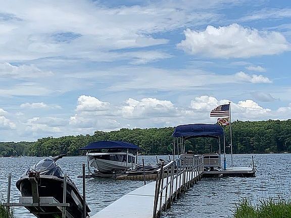 Stunning lodge-style home on two level parcels with 373' of lakefront and 3.81 acres. Located at the end of the lane with superb privacy and beautifully landscaped grounds, including flagstone patios & a campfire ring. The newly added timber frame wing and separate guest house combine the feelings of rustic cottage charm and modern lodge living. And, 3 gorgeous stone wood fireplaces set the tone!